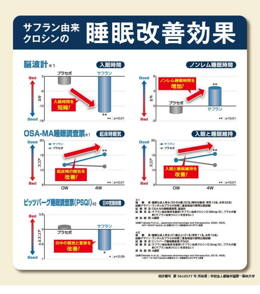 機能性関与成分「サフラン由来クロシン」には、睡眠の質が低いと感じている方の深睡眠をすみやかにもたらし、睡眠の質(寝つき、ぐっすり眠れること、眠りが深いこと、睡眠中に目が覚めないこと)を高める機能、すっきりと目覚められる機能が報告されています。